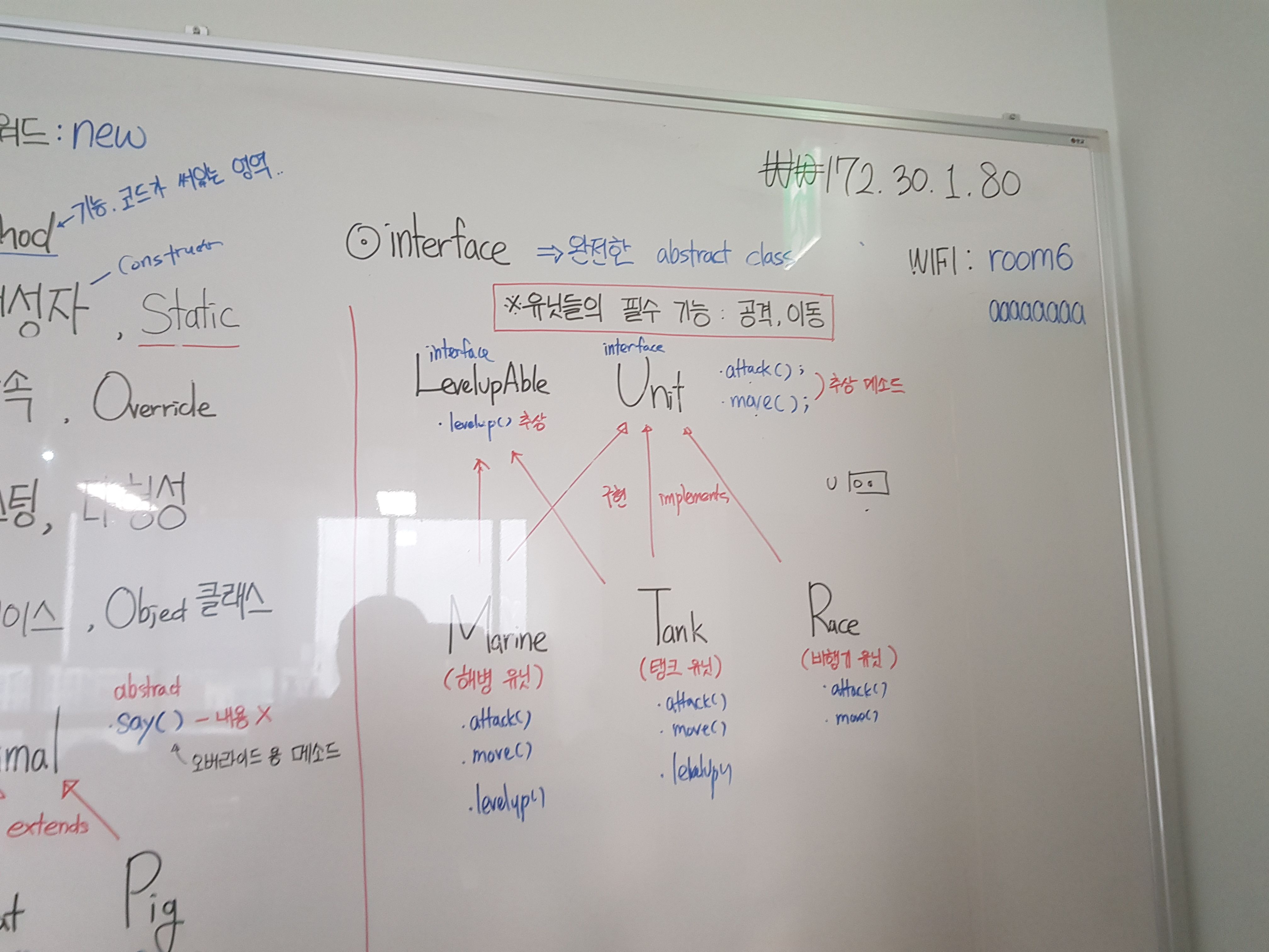 Marine과 Race는 Unit, LevelUpAble 인터페이스를 상속받아 attack, move,levelUp 메소드를 오버라이드 했다